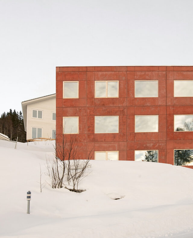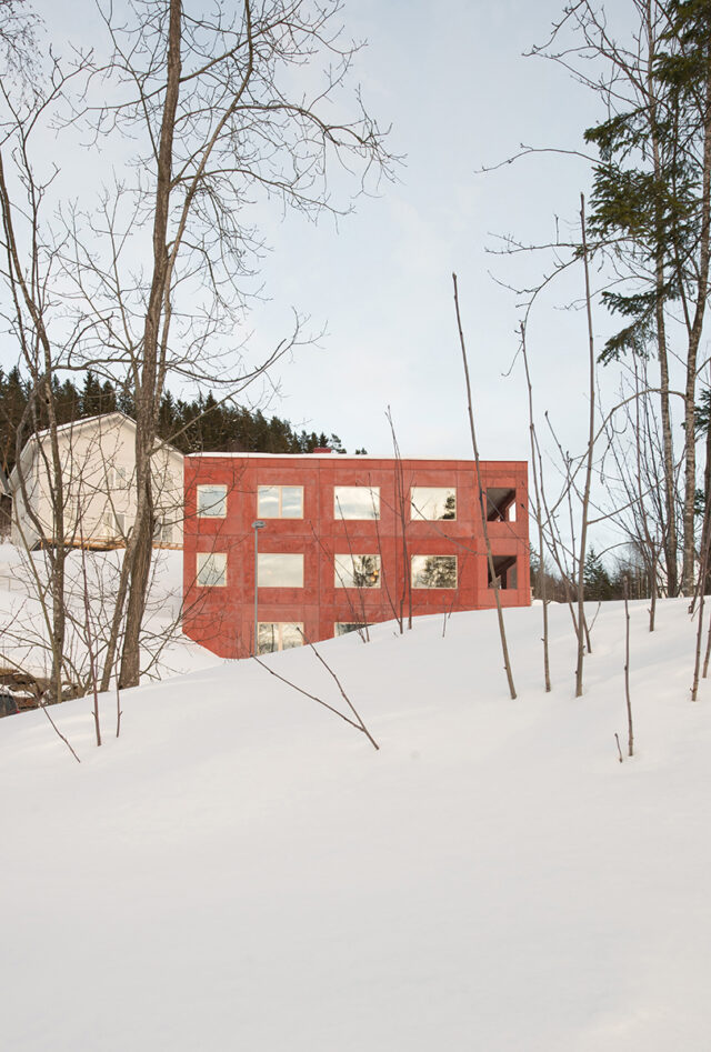 The red concrete house at Lillehammer, Norway, is made as a repetetive building kit enabling the home owners to do big parts of the building work themselves.