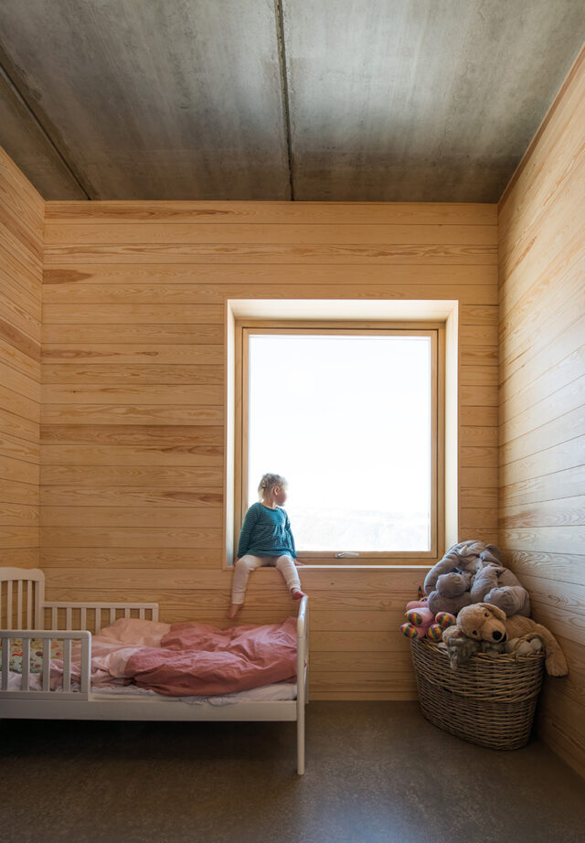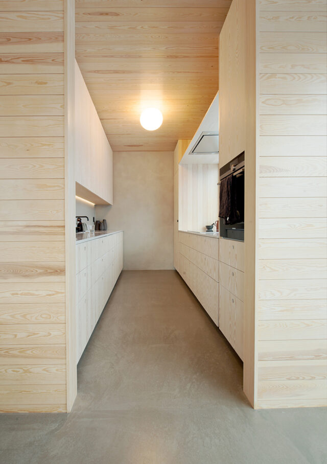 The interior of the kitchen and living room is made from knot free pine paneling, both on walls and in the ceiling. In the rest of the house the concrete slabs are exposed in the ceiling. On the floors there is used standard cement screed. Site built furniture is made in pine plywood.