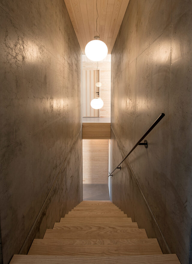 The location is steep, with a height difference of about 10m (32ft) within a 650 sqm site. In order to fit the program to the site, to work within the height regulations and also make use of the beautiful view as much as possible, a large part of the house is placed into the hilll side. The house is angled diagonally to the terrain fall to generate